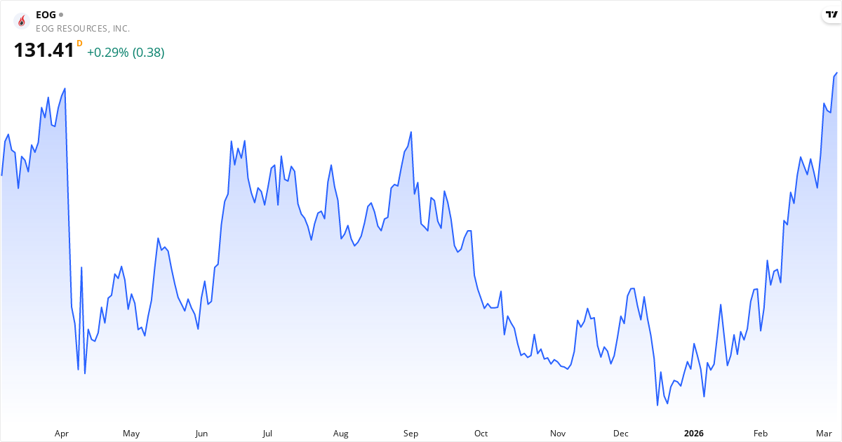 EOG Resources aktiekurs – Kursutveckling 2026. Uppdaterad 08. Mar 2026.
