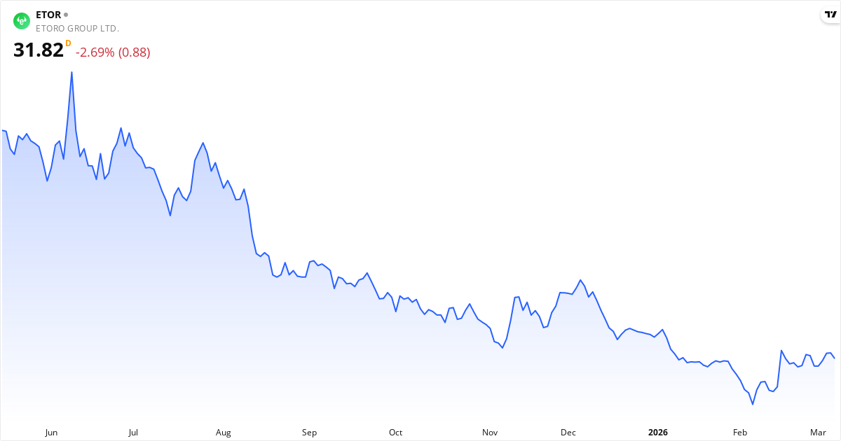 Death Cross: 50-dagars genomsnittet (31.36) ligger under 200-dagars (44.60), vilket är en klassisk bearish signal for eToro Group Ltd..