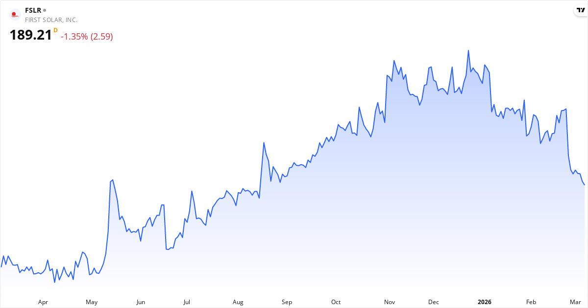 First Solar aktiekurs – Kursutveckling 2026. Uppdaterad 08. Mar 2026.
