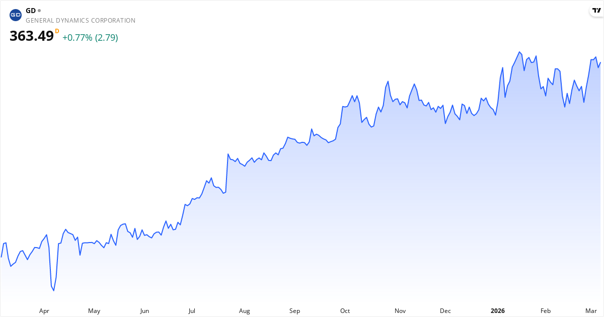 General Dynamics aktiekurs – Kursutveckling 2026. Uppdaterad 08. Mar 2026.