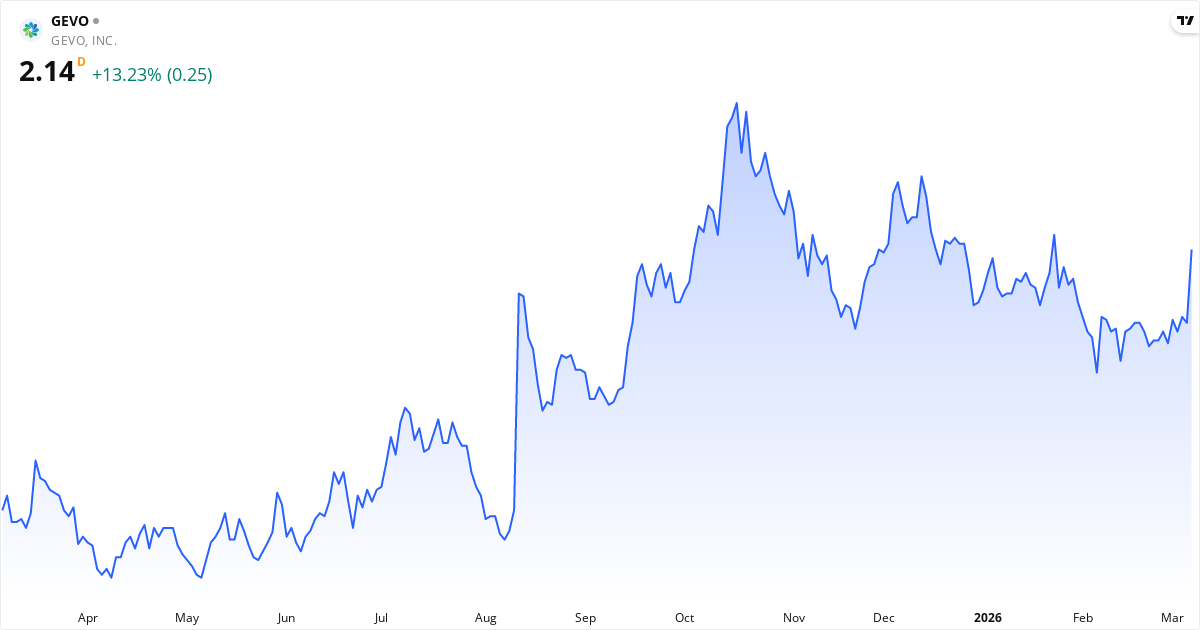 Gevo publicerar nästa rapport den 13. maj 2026. Aktien handlas för närvarande till 2.14 $.
