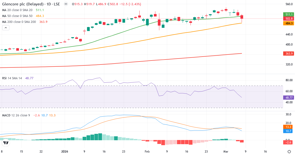 Golden Cross: 50-dagars genomsnittet (484.32) ligger över 200-dagars (363.87), vilket är en klassisk bullish signal for Glencore plc.