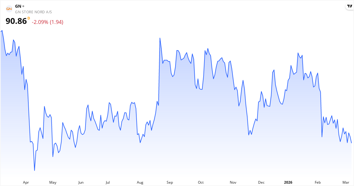 GN Store Nord aktiekurs – Kursutveckling 2026. Uppdaterad 08. Mar 2026.