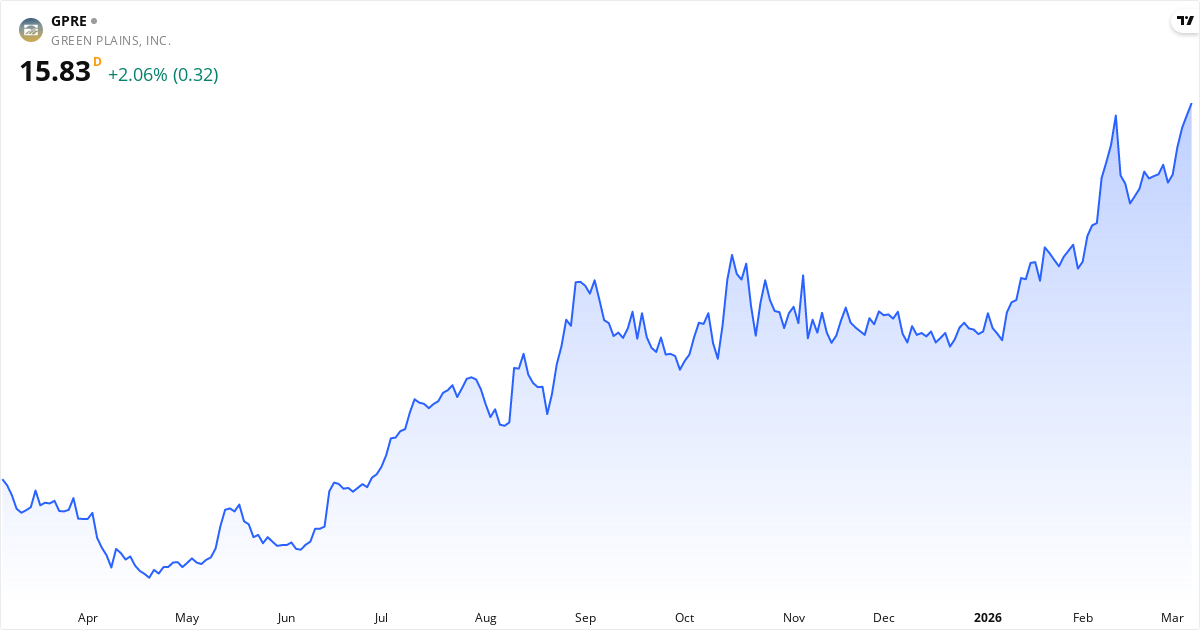 Green Plains aktiekurs – Kursutveckling 2026. Uppdaterad 08. Mar 2026.
