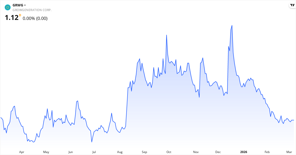 GrowGeneration publicerar nästa rapport den 18. mars 2026. Aktien handlas för närvarande till 1.12 $.