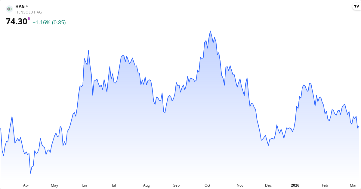 Hensoldt handlas till ett P/E på 73.2, vilket er över markedsgenomsnittet. Forward P/E er 86.2. P/S-ratioen er 3.5. P/B er 10.8. PEG-ratioen er 3.78 — över 2.0 tyder på at aktien är dyr i förhållande tillväxtraten.