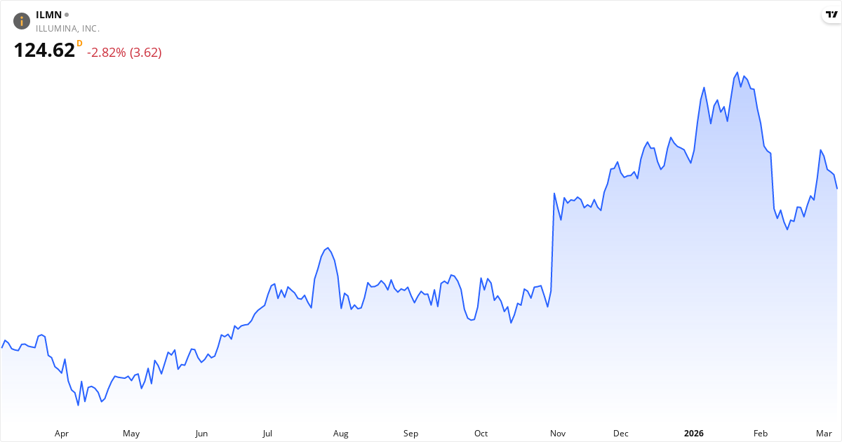 Illumina aktiekurs – Kursutveckling 2026. Uppdaterad 08. Mar 2026.