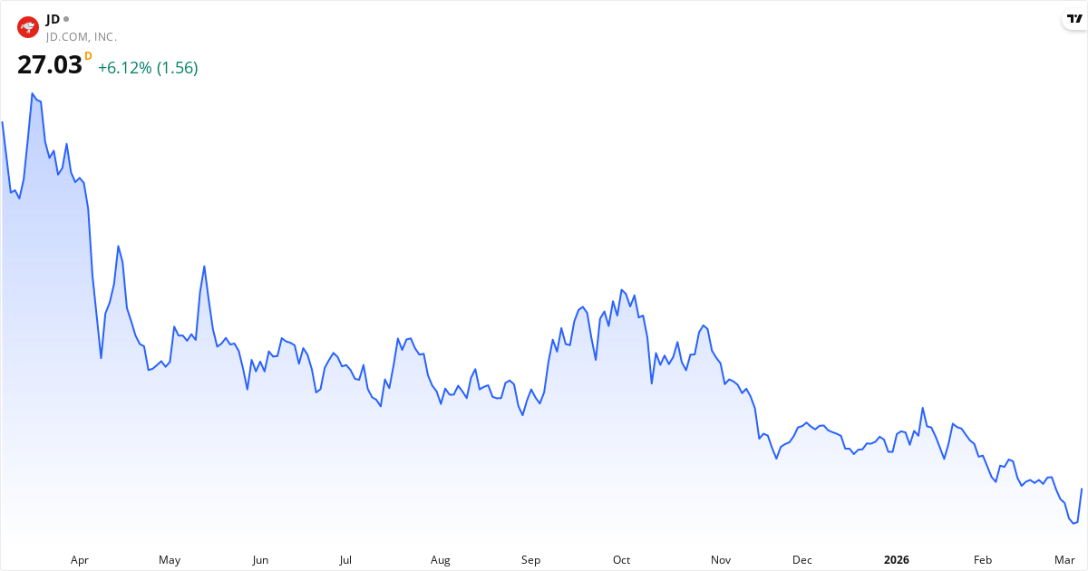 JD.com handlas till ett P/E på 8.3, vilket är under markedsgenomsnittet och kan indikera en attraktiv pris. Forward P/E er 9.2. P/S-ratioen er 0.0 (lav — potentiellt undervärderad ift. omsättning). P/B er 1.1. PEG-ratioen er 1.27.