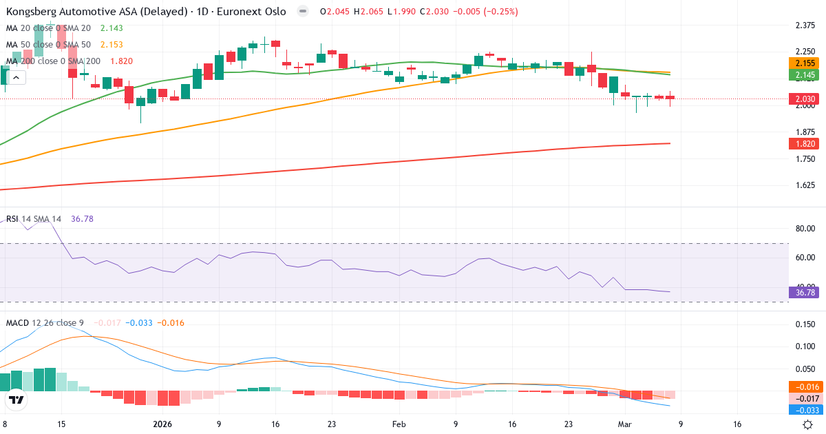 Kongsberg Automotive ASA har ett RSI på 36.8. Aktien befinder sig i den lave del av neutral zone, vilket tyder på svagt momentum uden at vare översåld.