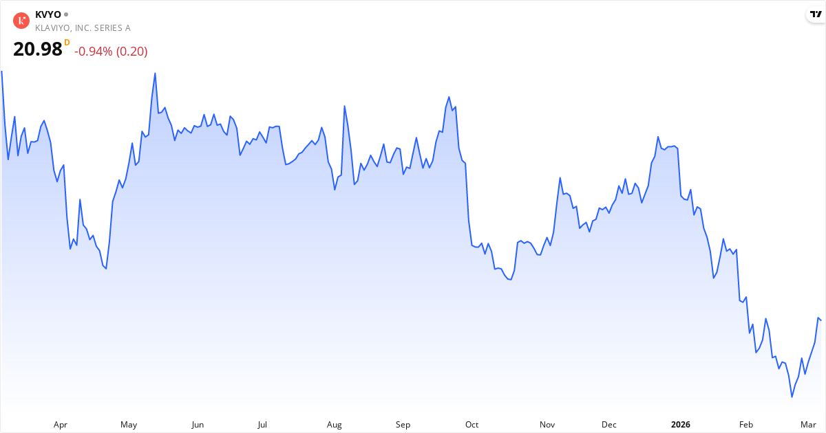 Klaviyo aktiekurs – Kursutveckling 2026. Uppdaterad 08. Mar 2026.