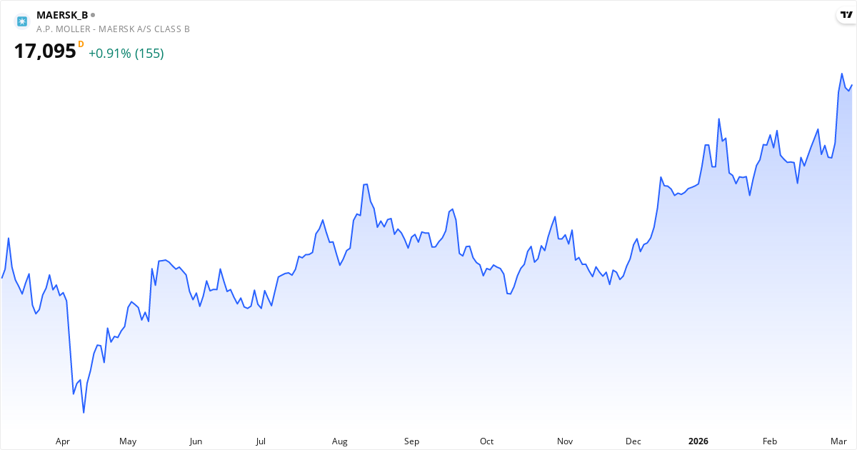 A.P. Møller - Mærsk B stiger för närvarande. De tekniske indikatorer visar: kursen ligger 8.1% över 20-dagars genomsnittet; MACD är positiv med stigende momentum (bullish signal); insiders har övervejende köpt aktien på det senaste. Senaste nyheter der kan påvirke kursen: Selskabet indkalder til fuldt elektronisk ordinær generalforsamling 25. marts 2026 kl. 15:00 CET. Dagsordenen omfatte... (02/03, Øvrige ændringer); Mærsk har i uge 9 2026 købt egne aktier under det annoncerede program på op til 6,3 mia. kr. Der blev købt 1.590 A ak... (02/03, Tilbagekøb af egne aktier); Vincent Clerc fra ledelsen har solgt 1.087 Maersk B-aktier på Nasdaq Copenhagen den 23. februar 2026 til 15.676 kr pr... (24/02, Insider Salg). För den senaste kontexten, se vår tekniska analys, insider-sektion och nyhetsöversikt ovan.