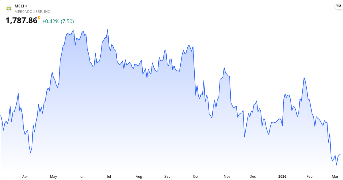 MercadoLibre aktiekurs – Kursutveckling 2026. Uppdaterad 08. Mar 2026.