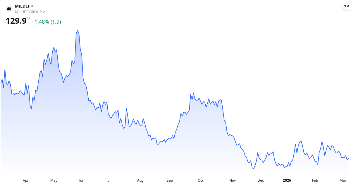 Den aktuella kursen är Kr.129.9, vilket placerar MilDef Group i kategorin undervärderad. Aktien bedöms som undervärderad, om kursen är under Kr.189, och som övervärderad, om kursen överstiger Kr.231.
