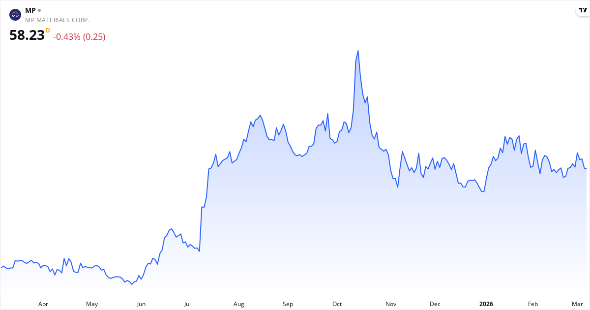 MP Materials publicerar nästa rapport den 30. april 2026. Aktien handlas för närvarande till 58.23 $.