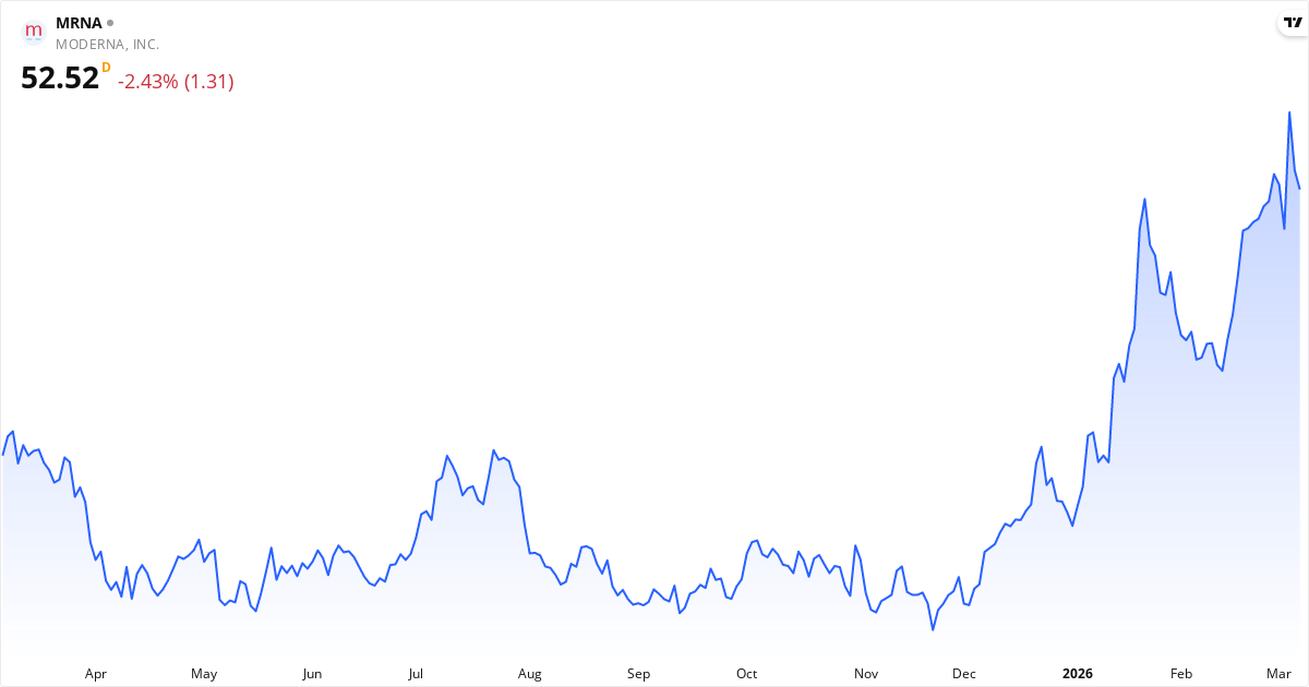 Moderna publicerar nästa rapport den 30. april 2026. Aktien handlas för närvarande till 52.52 $.
