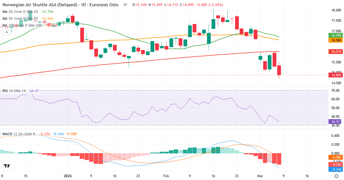 Golden Cross: 50-dagars genomsnittet (16.57) ligger över 200-dagars (15.79), vilket är en klassisk bullish signal for Norwegian Air Shuttle ASA.