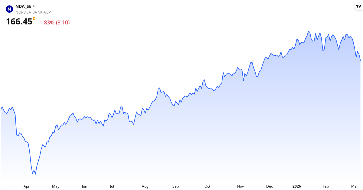 Nyheden: Nordea Bank Abp præsenterede deres første kvartalsrapport for 2025, der viser en nedgang i netto renteindtægter på 6% grundet politikrentesænkninger. Omkostninger steg med 5%, mens driftsresultatet faldt med 9% sammenlignet med året før, men steg 10% fra forrige kvartal. Banken fastholder en stabil egenkapitalforrentning på 15,7% og har igangsat et aktietilbagekøbsprogram på 250 mio. euro. På trods af fald i nogle indtægtskilder viser Nordea fortsat robust vækst i forretningsvolumen og høj rentabilitet.