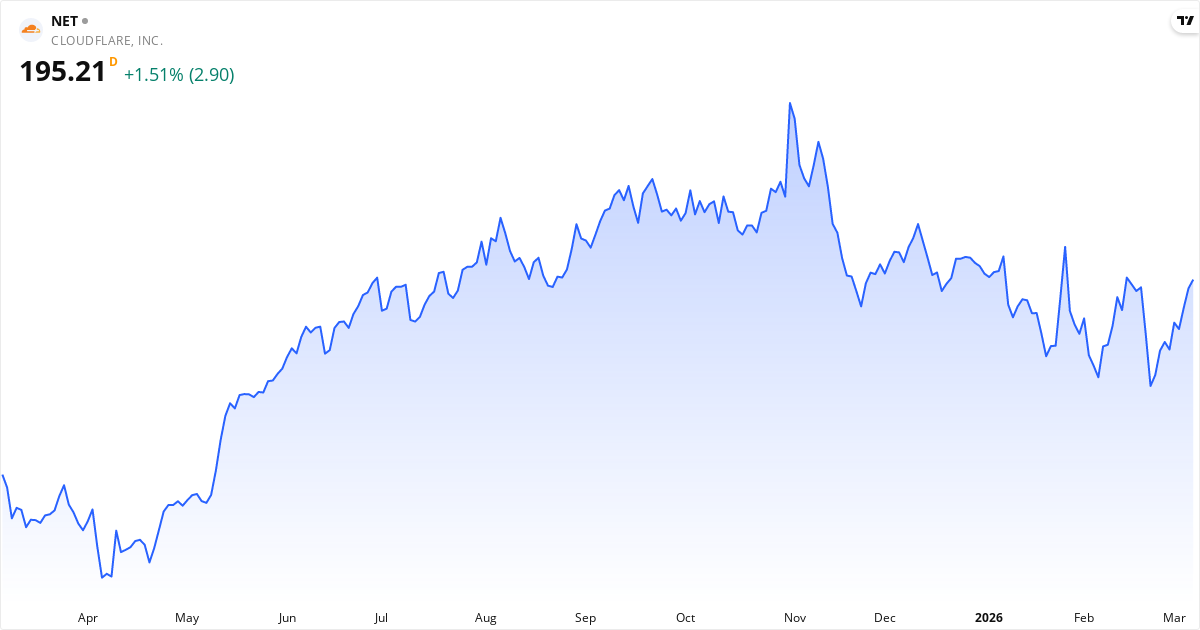 Cloudflare publicerar nästa rapport den 07. maj 2026. Aktien handlas för närvarande till 195.19 $.