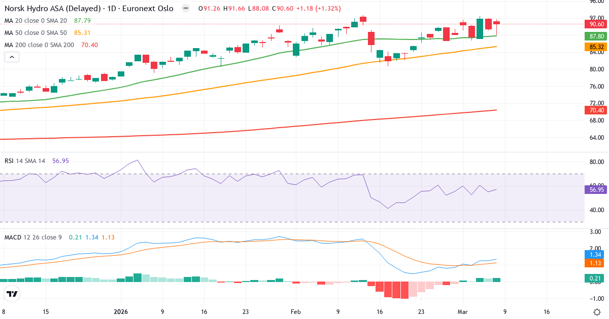 Golden Cross: 50-dagars genomsnittet (85.32) ligger över 200-dagars (70.40), vilket är en klassisk bullish signal for Norsk Hydro ASA.
