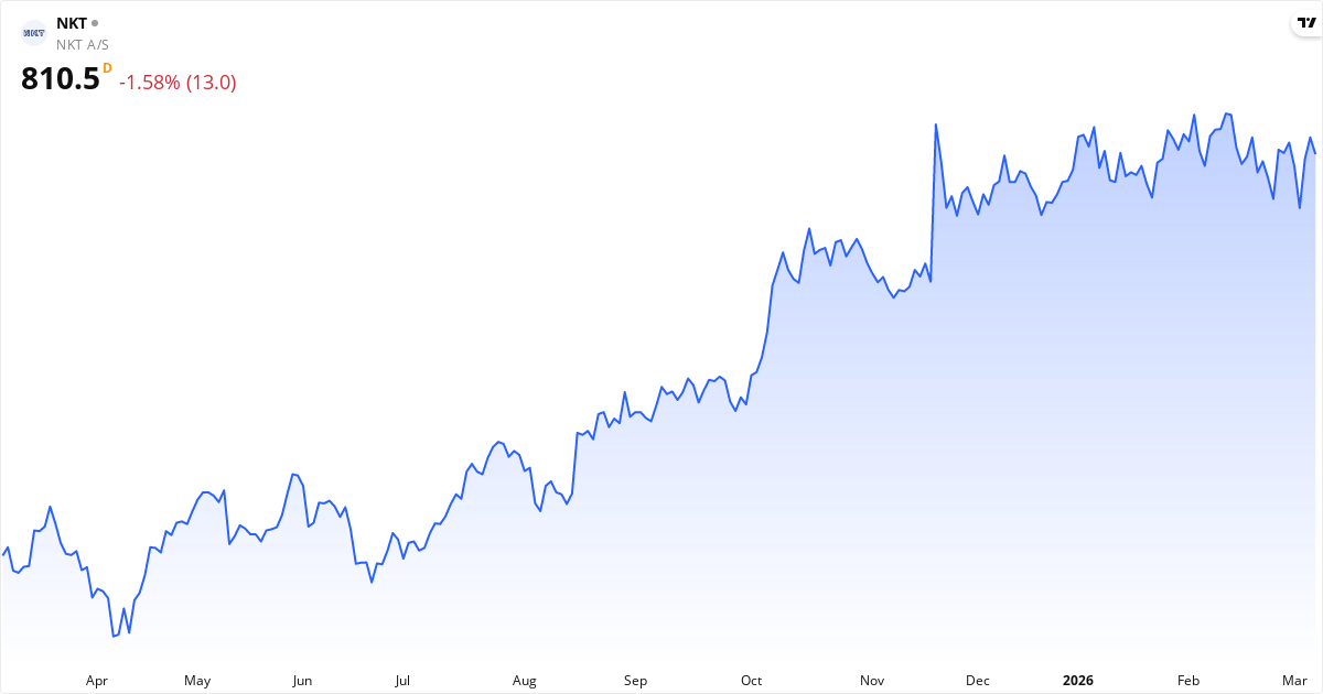 NKT handlas till ett P/E på 22.1, vilket er nära markedsgenomsnittet. Forward P/E er 37.6. P/S-ratioen er 12.2 (hög — marknaden betalar en premium for omsättningen). P/B er 2.6. PEG-ratioen er 7.20 — över 2.0 tyder på at aktien är dyr i förhållande tillväxtraten.