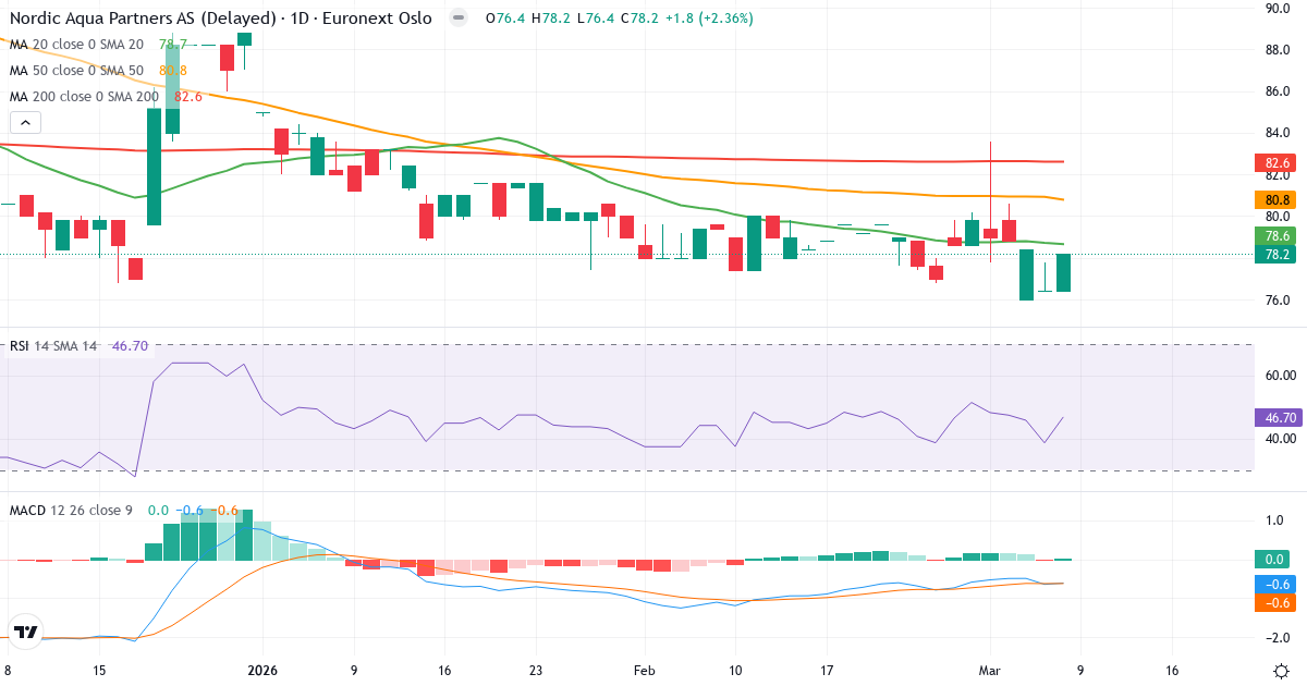 Death Cross: 50-dagars genomsnittet (80.60) ligger under 200-dagars (82.60), vilket är en klassisk bearish signal for Nordic Aqua Partners A/S.