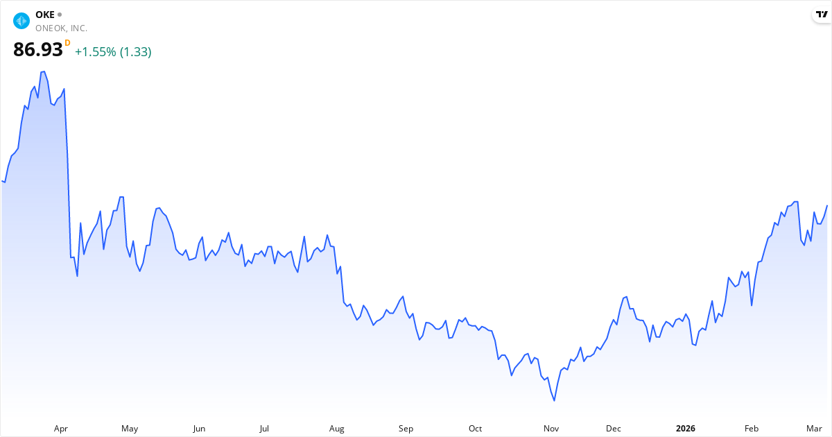 ONEOK aktiekurs – Kursutveckling 2026. Uppdaterad 08. Mar 2026.