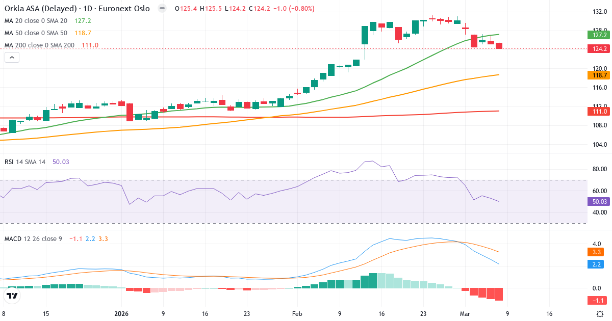 Orkla ASA är i en kortsiktig nedtrend. Kursen på 124.20 Kr. ligger 2.3% under 20-dagars genomsnittet (127.16 Kr.). På medellång sikt er bilden positiv: kursen ligger 4.7% över 50-dagars genomsnittet (118.67 Kr.). Långsiktigt ligger aktien 11.9% över 200-dagars genomsnittet (111.02 Kr.), vilket bekräftar en långsiktigt upptrend.
