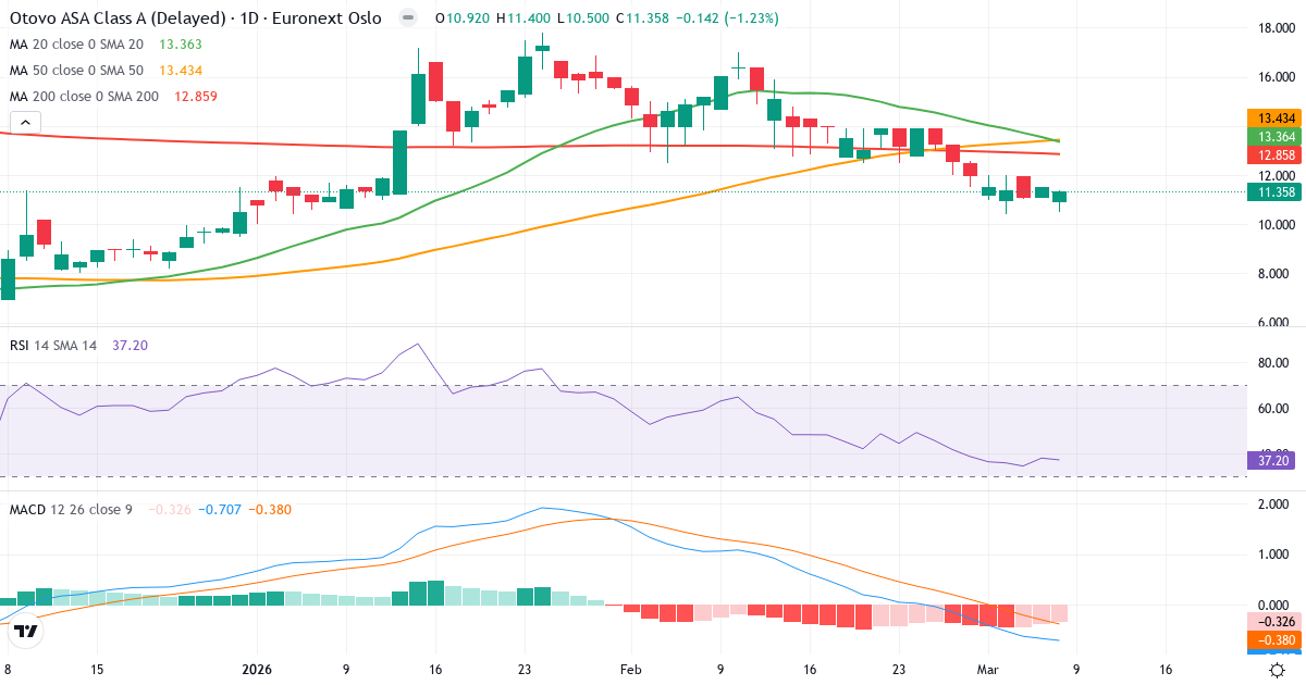 Golden Cross: 50-dagars genomsnittet (13.43) ligger över 200-dagars (12.86), vilket är en klassisk bullish signal for Otovo AS.