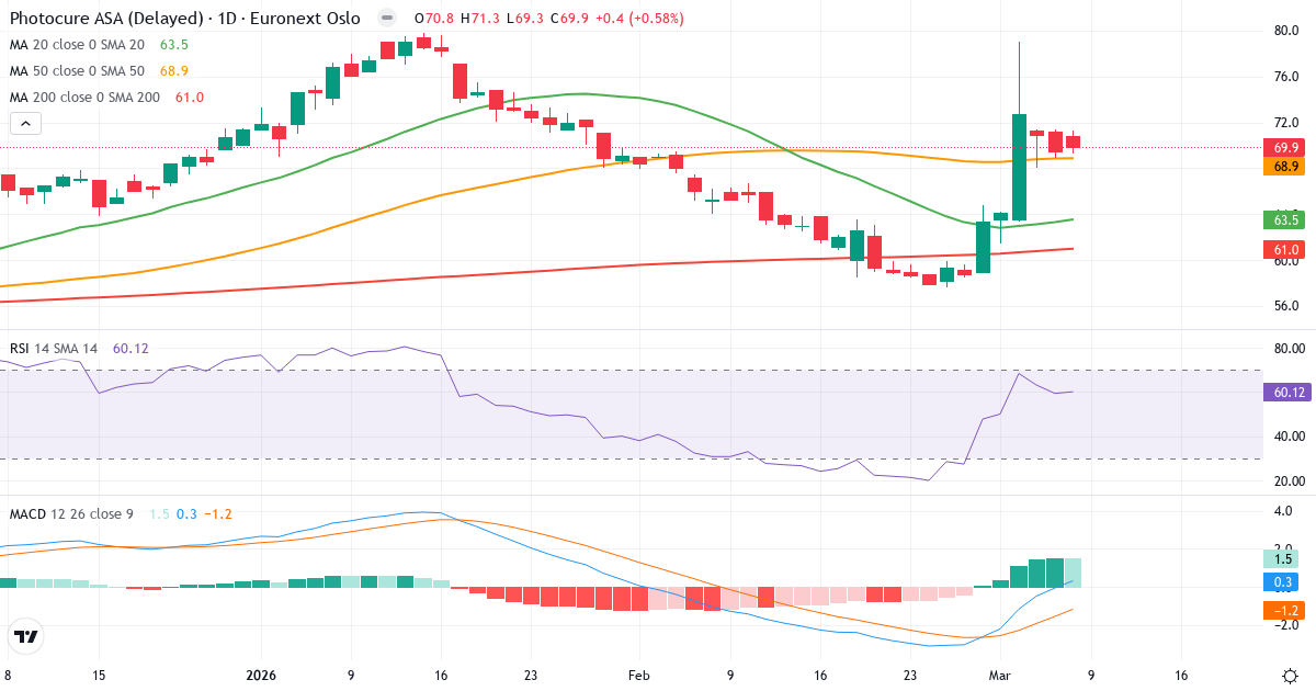 Golden Cross: 50-dagars genomsnittet (68.87) ligger över 200-dagars (60.98), vilket är en klassisk bullish signal for Photocure ASA.