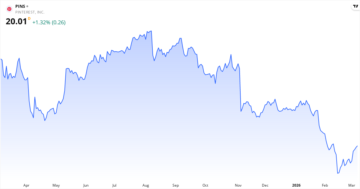 Pinterest aktiekurs – Kursutveckling 2026. Uppdaterad 08. Mar 2026.