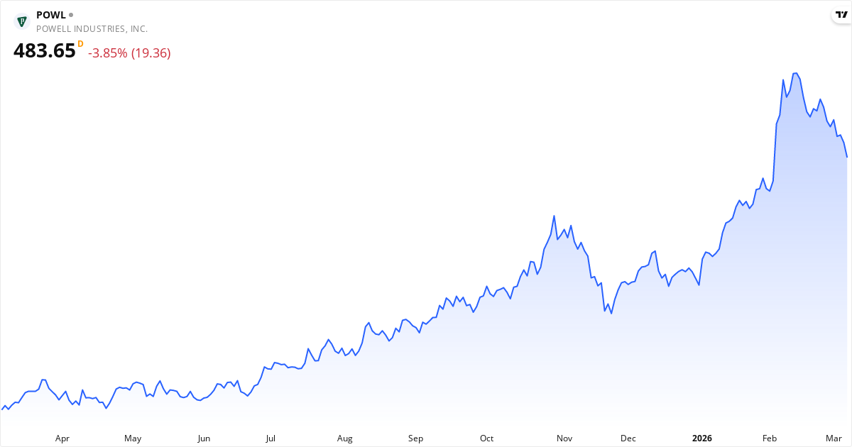 Powell Industries aktiekurs – Kursutveckling 2026. Uppdaterad 08. Mar 2026.