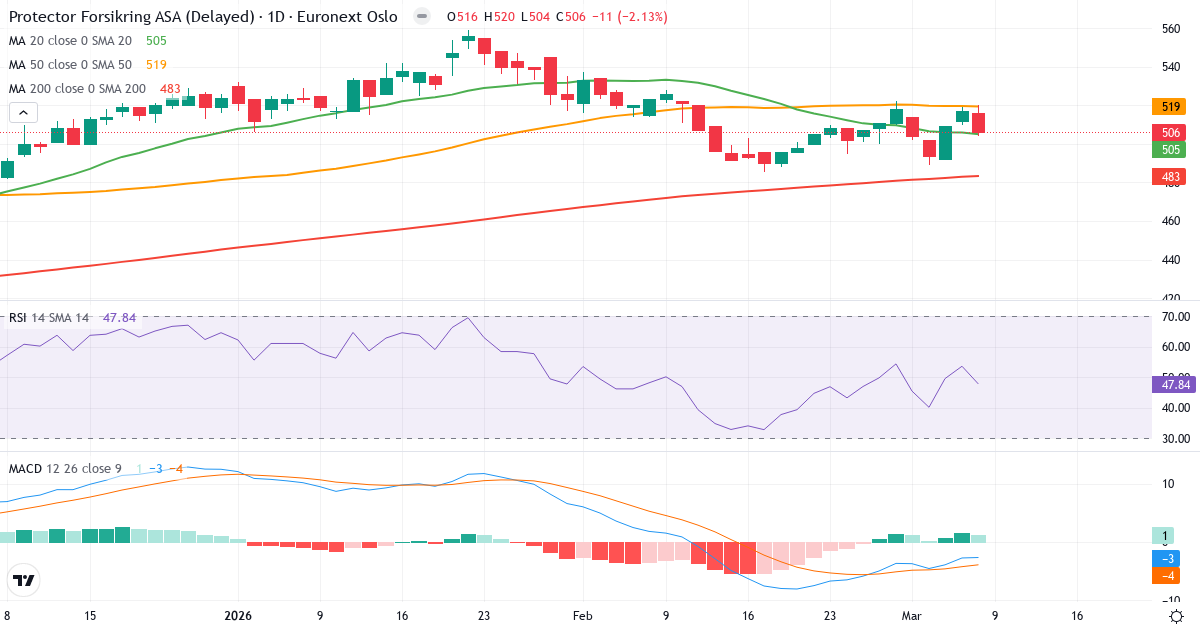 Golden Cross: 50-dagars genomsnittet (516.25) ligger över 200-dagars (476.65), vilket är en klassisk bullish signal for Protector Forsikring ASA.