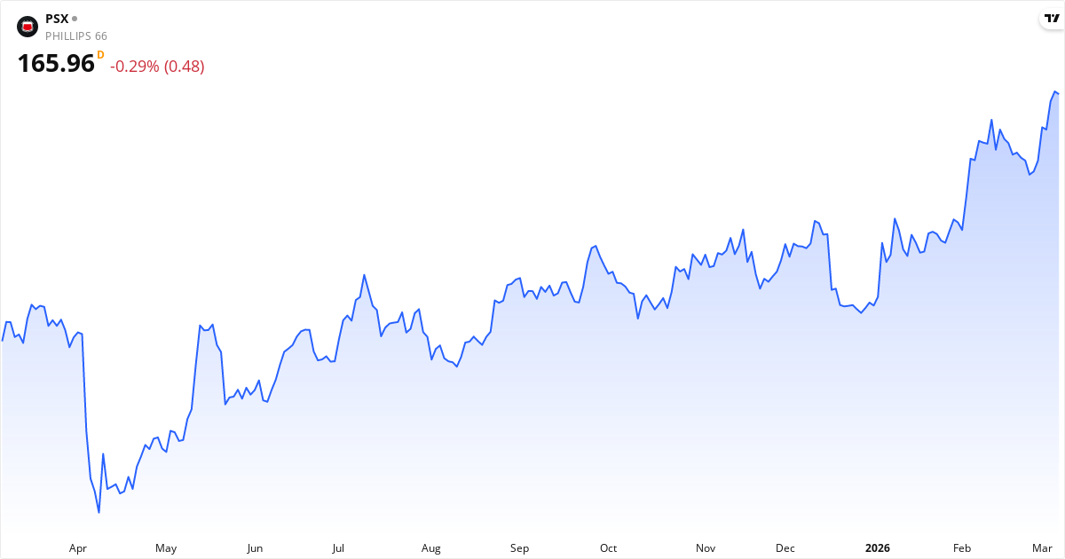 Kursutveckling for Phillips 66 (PSX.US) – aktiekurs på 165.96 $, marts 2026