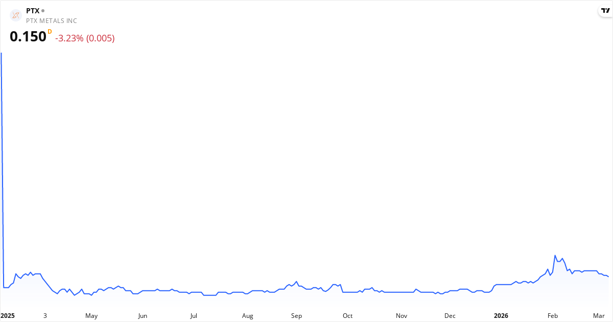 PTX Metals Inc., together with its subsidiaries, explores for and evaluates mineral properties in Canada. It explores for gold, chromite, copper, nickel, and platinum group element deposits, as well as base metals deposits. The company was formerly known as Platinex Inc. and changed its name to PTX Metals Inc. in February 2024. PTX Metals Inc. was incorporated in 1998 and is based in Toronto, Canada. Läs om företagetNyckeltal for PTX Metals