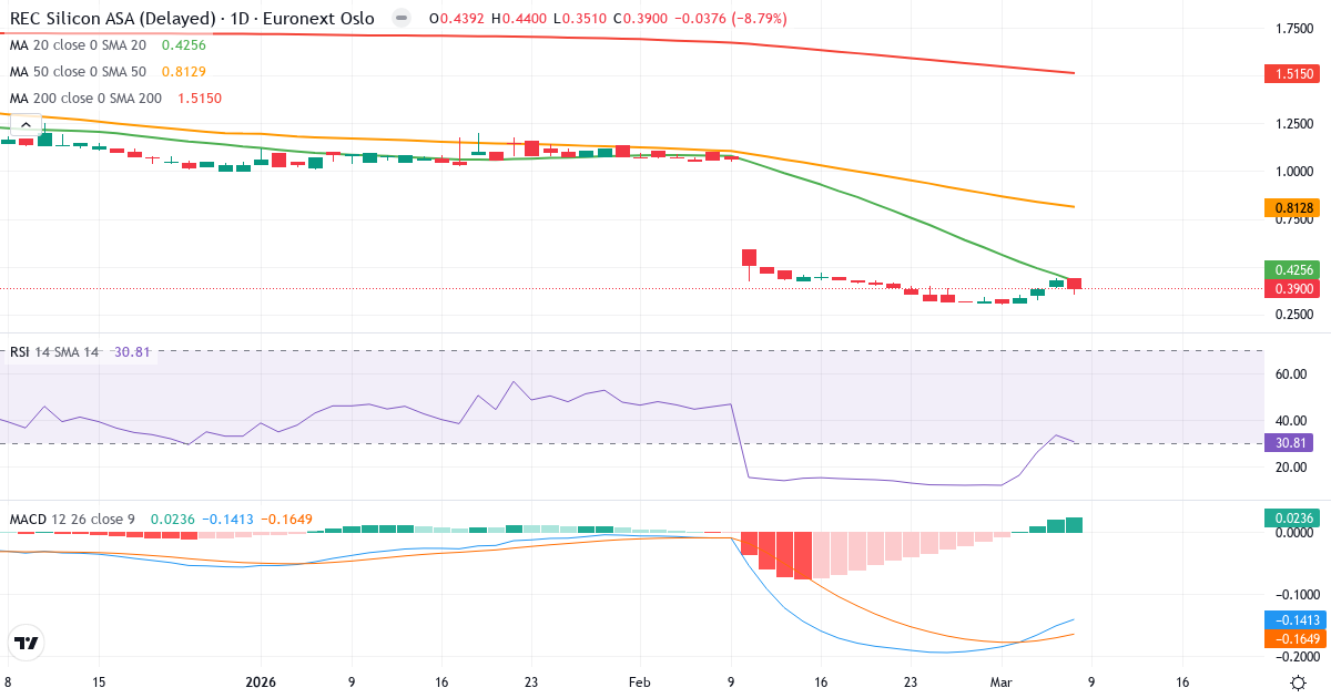 Death Cross: 50-dagars genomsnittet (0.81) ligger under 200-dagars (1.52), vilket är en klassisk bearish signal for REC Silicon ASA.