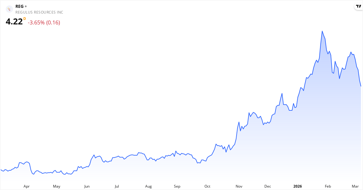 Golden Cross: 50-dagars genomsnittet (4.63) ligger över 200-dagars (3.16), vilket är en klassisk bullish signal for Regulus Resources Inc.