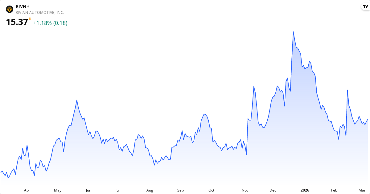 Rivian Automotive publicerar nästa rapport den 12. maj 2026. Aktien handlas för närvarande till 15.37 $.