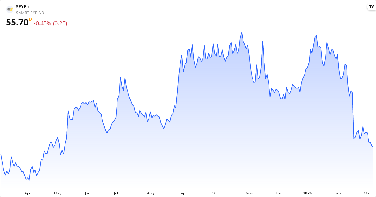 Den aktuella kursen är Kr.55.7, vilket placerar Smart Eye i kategorin undervärderad. Aktien bedöms som undervärderad, om kursen är under Kr.99, och som övervärderad, om kursen överstiger Kr.121.