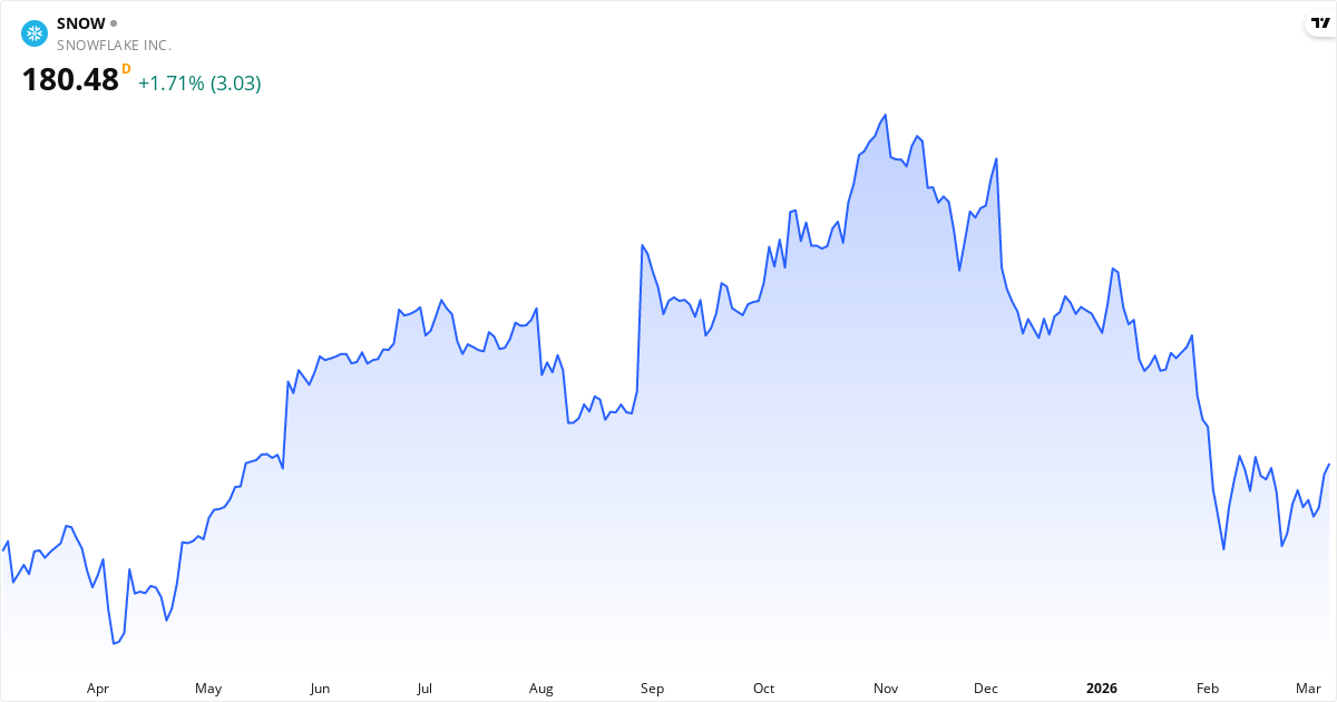 Snowflake publicerar nästa rapport den 27. maj 2026. Aktien handlas för närvarande till 180.48 $.