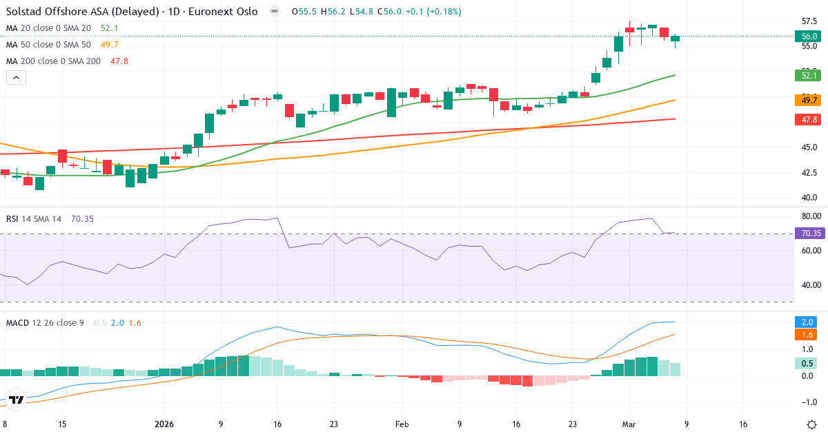Solstad Offshore ASA har ett RSI på 70.4, vilket placerar aktien i överköpt territorium (över 70). Även om aktien är överköpt, är den övergripande trenden positiv. En kortvarig korrigering är möjlig, men trenden stödjer fortfarande kursen.