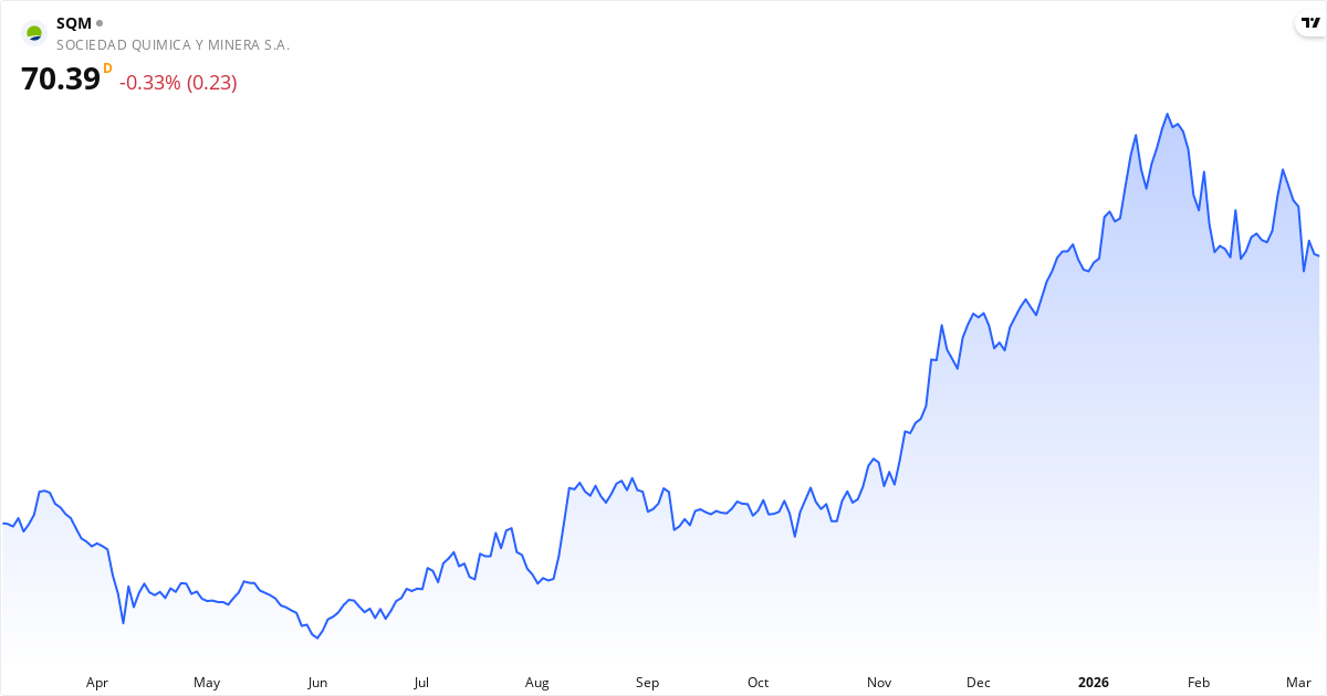 Sociedad Química y Minera de Chile, eller SQM.US, driver en stor verksamhet med specialkemikalier och gruvdrift. De tjänar primärt pengar på att tillverka och sälja en rad specialprodukter. SQM.US är särskilt kända för sitt litium och dess derivat, som är viktiga för batterier och elektronik. De producerar också jod för medicin och industri samt kaliumnitrat och andra specialgödselmedel för jordbruket. De tillverkar till exempel litiumkarbonat för batterier och keramiska material. Företaget grundades 1968 och har sedan dess utökat sin verksamhet till att betjäna kunder globalt. SQM.US är en av de stora aktörerna inom dessa nischmarknader. Läs om företagetNyckeltal for Sociedad Química y Minera de Chile