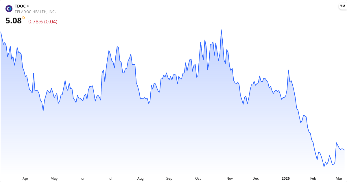 Teladoc Health aktiekurs – Kursutveckling 2026. Uppdaterad 08. Mar 2026.