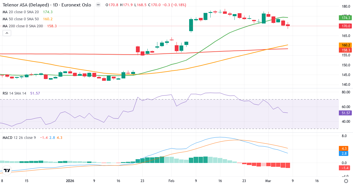 Golden Cross: 50-dagars genomsnittet (160.26) ligger över 200-dagars (156.01), vilket är en klassisk bullish signal for Telenor ASA.