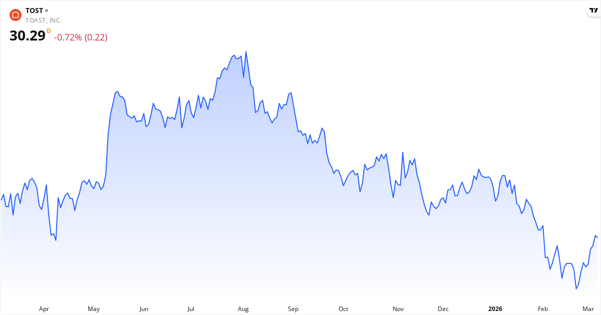 Toast publicerar nästa rapport den 07. maj 2026. Aktien handlas för närvarande till 30.29 $. Med ett P/E-tal på 54.5 kommer marknaden hålla utkik efter om intjäningen lever upp till förväntningarna.