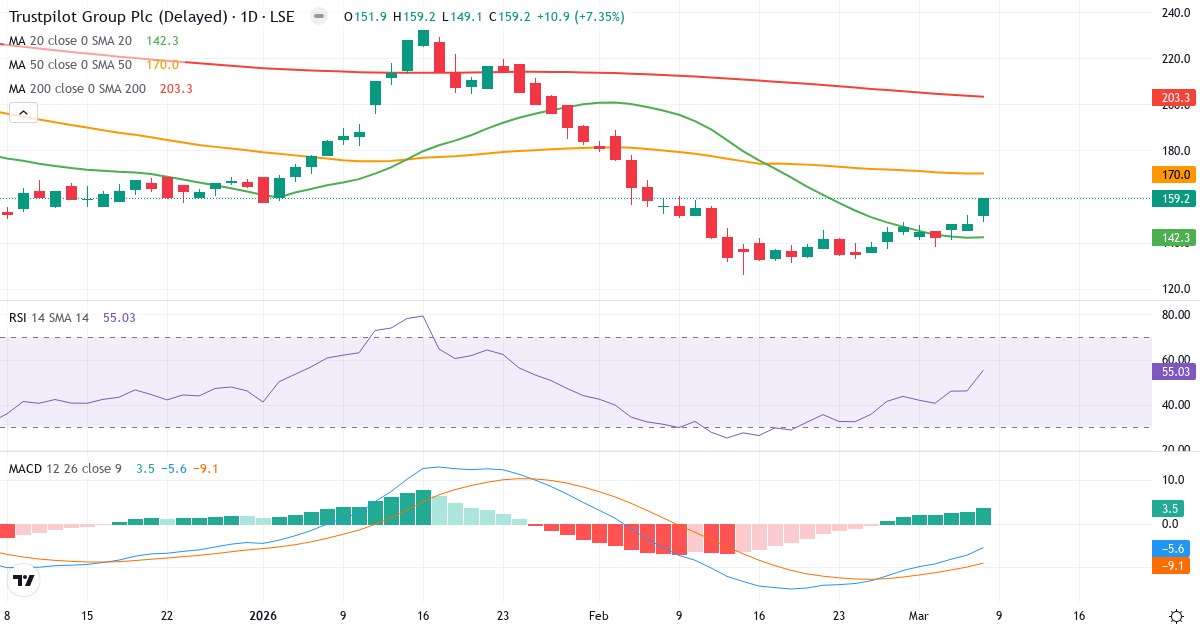 Trustpilot Group plc är i en kortsiktig upptrend. Kursen på 159.20 £ ligger 11.9% över 20-dagars genomsnittet (142.31 £). På medellång sikt er bilden negativ: kursen ligger 6.3% under 50-dagars genomsnittet (169.97 £). Långsiktigt ligger aktien 21.7% under 200-dagars genomsnittet (203.30 £), vilket indikerar en långsiktigt nedtrend.