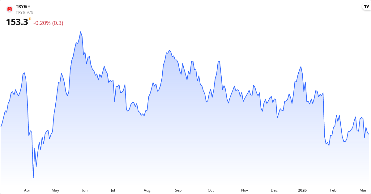 Tryg publicerar nästa rapport den 15. april 2026. Aktien handlas för närvarande till 153.30 Kr.. Med ett P/E-tal på 17.5 kommer marknaden hålla utkik efter om intjäningen lever upp till förväntningarna.