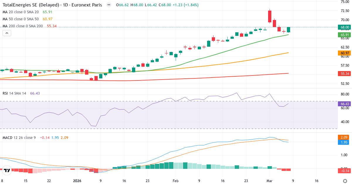 Golden Cross: 50-dagars genomsnittet (60.92) ligger över 200-dagars (54.27), vilket är en klassisk bullish signal for TotalEnergies SE.