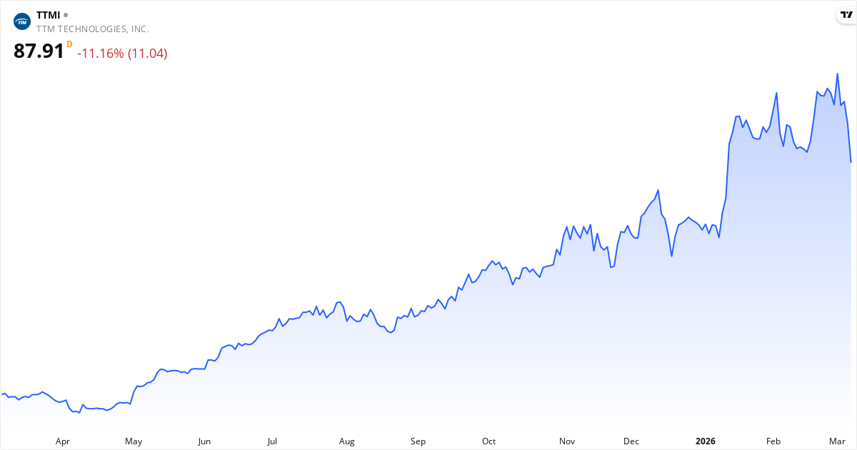 TTM Technologies aktiekurs – Kursutveckling 2026. Uppdaterad 08. Mar 2026.
