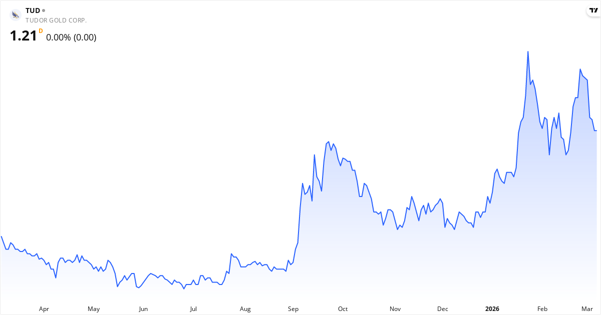 Den aktuella kursen är CAD1.21, vilket placerar Tudor Gold i kategorin undervärderad. Aktien bedöms som undervärderad, om kursen är under CAD2.61, och som övervärderad, om kursen överstiger CAD3.19.