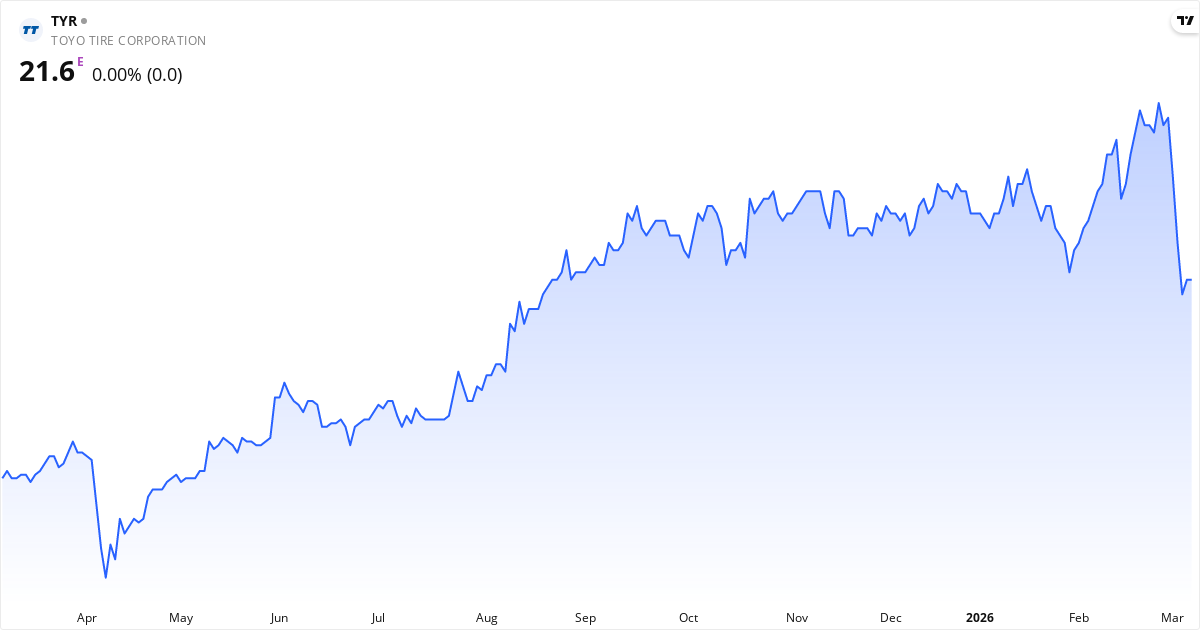 Toyo Tire Corporation manufactures and sells tires in Japan, North America, and internationally. It operates in two segments, Tires and Automotive Parts. The company provides tires for passenger vehicles, lights trucks, cars, SUVs, and buses under the Toyo Tires and Nitto. It also offers automotive parts, including engine/motor, member/differential, strut, and exhaust mounts; bush/couplings and constant velocity universal joint boot; and anti-vibration rubber for cars. Toyo Tire Corporation was formerly known as Toyo Tire & Rubber Co., Ltd. and changed its name to Toyo Tire Corporation in January 2019. The company was incorporated in 1943 and is headquartered in Itami, Japan. Läs om företagetNyckeltal for Toyo Tire